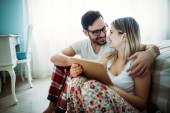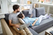 Pozytywne czuły Młoda para siedzi na podłodze i rozmawiając ze sobą podczas korzystania z laptopa i przeglądania Internetu w kuchni