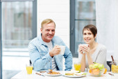 Zdjęcie "Przycinanie strzał młodych rozmyte kaukaski para siedzi na stole kuchennym, trzymając filiżanki świeżej kawy i uśmiechnięty szczęśliwie podczas śniadania w domu" może być wykorzystywane do celów osobistych i komercyjnych zgodnie z warunkami zakupionej licencji Royalty-free. Obraz jest dostępny do pobrania w jakości wysokiej rozdzielczości do 5760x3840.