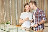 Przycinanie strzał młodych rozmyte kaukaski para siedzi na stole kuchennym, trzymając filiżanki świeżej kawy i uśmiechnięty szczęśliwie podczas śniadania w domu