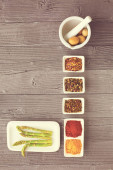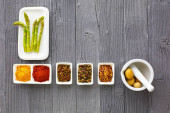Świeże szparagi serwowane na białym talerzu z rustykalnym drewnianym tle tabeli, widok z góry.