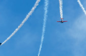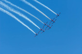 Torre Del Mar, Hiszpania - 29 lipca 2018 r. samoloty przelatujące nad plaży w nadmorskiej miejscowości, pokazy akrobacji w Andaluzji