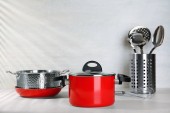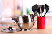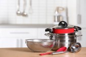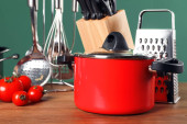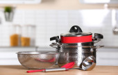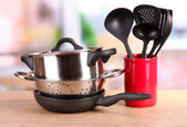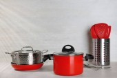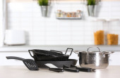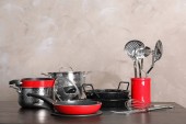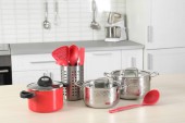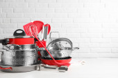 Zestaw czyste naczynia kuchenne i naczynia na stół w kuchni
