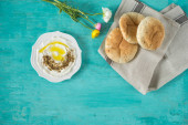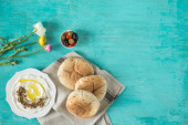 labneh (labaneh) Bliskiego Wschodu miękkich biały 's mleka koziego sera z oliwy z oliwek, oliwki, za'atar, cytryna, z chlebem pita przez czarny drewniany talerz, flatlay, widok z góry, miejsce