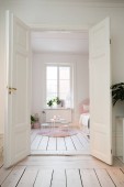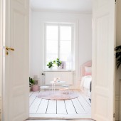 Stylowa Przytulna sypialnia z poduszkami i szklanymi drzwiami na balkonie