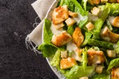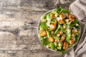 Sałatka Cezar z sałaty, kurczakiem i grzankami na drewnianym stole. Tło