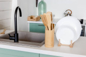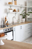 Zdjęcie "Biała kuchnia wnętrz w stylu skandynawskim z przyborami kuchennymi" może być wykorzystywane do celów osobistych i komercyjnych zgodnie z warunkami zakupionej licencji Royalty-free. Obraz jest dostępny do pobrania w jakości wysokiej rozdzielczości do 5760x3840.