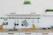 Biała kuchnia wnętrz w stylu skandynawskim z przyborami kuchennymi