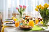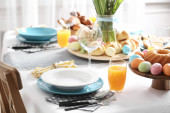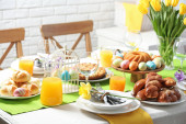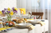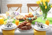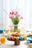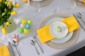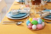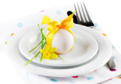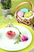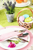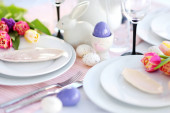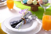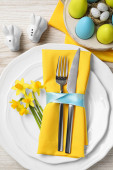 Świąteczne nakrycie stołu Wielkanoc z kwiatem, widok zbliżenie