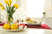Zdjęcie "Świąteczne nakrycie stołu Wielkanoc z kwiatem, widok zbliżenie" może być wykorzystywane do celów osobistych i komercyjnych zgodnie z warunkami zakupionej licencji Royalty-free. Obraz jest dostępny do pobrania w jakości wysokiej rozdzielczości do 5760x3840.