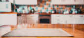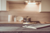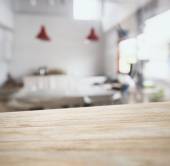 Tabeli top drewniany kontuar rozmycie kuchni spiżarnia domowy wnętrze