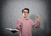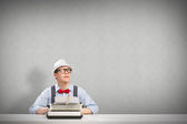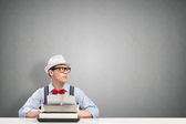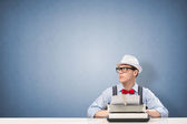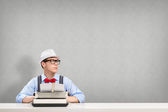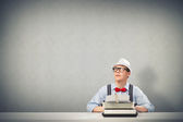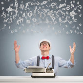 Młody pisarz w kapelusz i okulary za pomocą maszynę do pisania i wskazującego do góry nogami siedząc przy stole ścianę szarego betonu na tle.