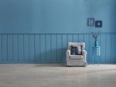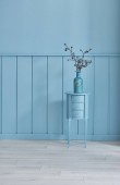 Biały kominek w salonie, niebieska ściana dekoracja wnętrz.
