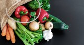 świeże warzywa organiczne w brązową papierową torbę na tle ciemnego tabeli