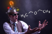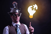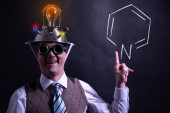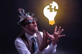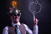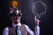 Zabawny nerd lub geek z aluminium kapelusz patrząc na pomysł żarówka