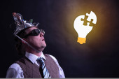 Zdjęcie "Zabawny nerd lub geek z aluminium kapelusz patrząc na pomysł żarówka" może być wykorzystywane do celów osobistych i komercyjnych zgodnie z warunkami zakupionej licencji Royalty-free. Obraz jest dostępny do pobrania w jakości wysokiej rozdzielczości do 5760x3840.