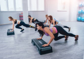 Fitness młodych kobiet z niebieskim fitballs. Trening przekrojowy. Koncepcja fitness.