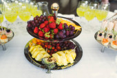 Talerz owoców z ananasem, winogron, brzoskwiń. Wnętrze restauracji