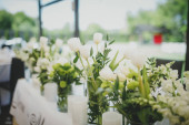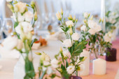 Wazony z róż i kwiaty na stole w restauracji, ślub obiad
