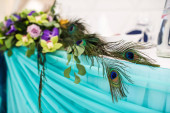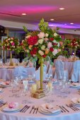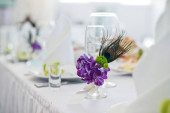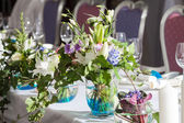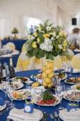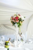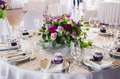 Wazon z kwiatami na lepszy okrągłego stołu, kolację w luksusowej restauracji