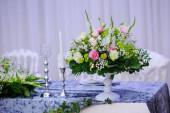 Zdjęcie "Weselne ozdobione kwiatami i Pawich piór, kolacja w restauracji, bankiet" może być wykorzystywane do celów osobistych i komercyjnych zgodnie z warunkami zakupionej licencji Royalty-free. Obraz jest dostępny do pobrania w jakości wysokiej rozdzielczości do 5760x3840.
