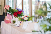Weselne ozdobione kwiatami i Pawich piór, kolacja w restauracji, bankiet