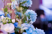 Weselne udekorowane kwiatami, obiad w restauracji, bankiet