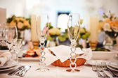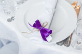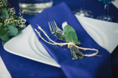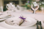 Serwowane tabeli z płyty, białe serwetki i okulary zdobią fioletowe kwiaty, kolacja w restauracji