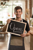 Pracownika supermarketu, prezentując schowka z jesteśmy otwarte tex