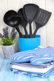 Kuchnia ustawienia: naczynie, chwytaków, ręczniki i jeszcze na drewnianym stole