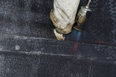 Zdjęcie "Buty z brezentu imregnowanego podczas prac w świetle latarni. Pracy z przemysłowych: czyste ścieki, wod-kan na podstawie w budynku." może być wykorzystywane do celów osobistych i komercyjnych zgodnie z warunkami zakupionej licencji Royalty-free. Obraz jest dostępny do pobrania w jakości wysokiej rozdzielczości do 5760x3840.