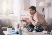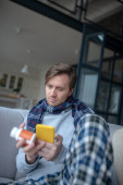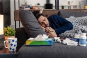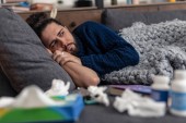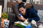 Smutny chory młody człowiek przyjmuje leki na jego