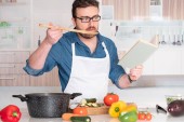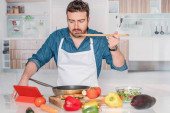 Zdjęcie "Portret człowieka nauczyć się gotować w kuchni" może być wykorzystywane do celów osobistych i komercyjnych zgodnie z warunkami zakupionej licencji Royalty-free. Obraz jest dostępny do pobrania w jakości wysokiej rozdzielczości do 5760x3840.