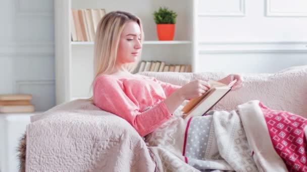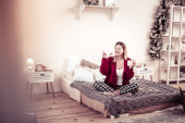 Dość młoda dziewczynka długowłosy odpoczynku na łóżku i trzymając pomarańczowe tabletki