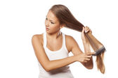 Młoda dziewczyna posiadanie problem rezygnować czesanie jej włosy na szarym tle