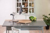 Nowa koncepcja nowoczesnej kuchni, Akcesoria kuchenne z nowymi meblami i rozmyte wygląd w tle