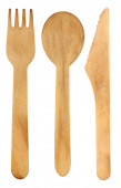 Jednorazowy zestaw drewnianych sztućców izolowany na białym tle