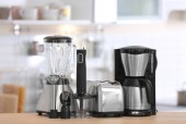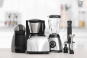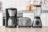 Nowoczesne AGD na drewnianym stole w kuchni. Miejsca na tekst