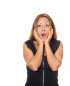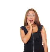 zaskoczony młoda kobieta w żółtą koszulkę. włosy w ruch.