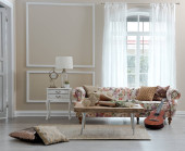 Brown pokój dzienny klasyczne tło ściany, lampa sofa i krzesło.