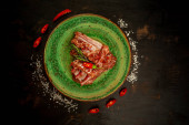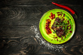 Krótkie żeberka wołowe z pikantnym sosem jagodowym i podawane z zielonymi sadzonkami na talerzu. Płytka głębokość pola. koncepcja kuchni azjatyckiej. restauracja serwuje. widok z góry, miejsce na tekst
