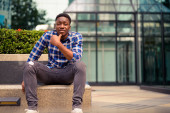 Młody biznesmen Afryki zadumany, siedział zewnątrz stacji metra