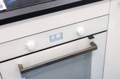 Szafka kuchenna z kratką do kuchni, białe i czarne płyty, kubki i tacę ociekową