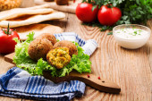 Kule ciecierzycy falafel na drewnianym biurku z warzywami