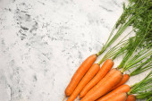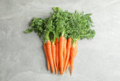 Wiklinowy kosz z dojrzałych marchew na stół szary, miejsca na tekst
