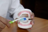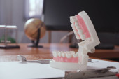 Dentysta, siedzi przy stole z modelu zębów i narzędzia w profesjonalny gabinet stomatologiczny, koncepcja medycznych i stomatologicznych