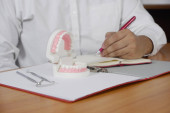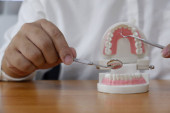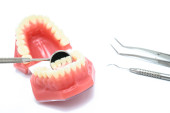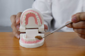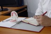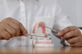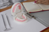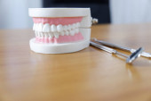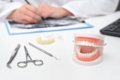 Dentysta, siedzi przy stole z modelu zębów i narzędzia w profesjonalny gabinet stomatologiczny, koncepcja medycznych i stomatologicznych