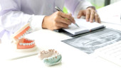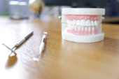Dentysta, siedzi przy stole z modelu zębów i narzędzia w profesjonalny gabinet stomatologiczny, koncepcja medycznych i stomatologicznych