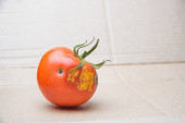 Zepsuty pomidor na tle tektury. Pomidor z pleśni. Choroba pomidora. Niewłaściwe przechowywanie warzyw.