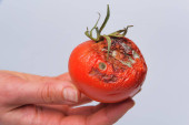 Zepsuty pomidor na tle tektury. Pomidor z pleśni. Choroba pomidora. Niewłaściwe przechowywanie warzyw.