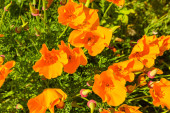 Bliska California Golden Poppy i Goldfields kwitnący w Walker Canyon Lake Elsinore, Ca. Stany Zjednoczone Ameryki. Jasny pomarańczowy kwiaty maku w California desert super bloom sezon wiosna.